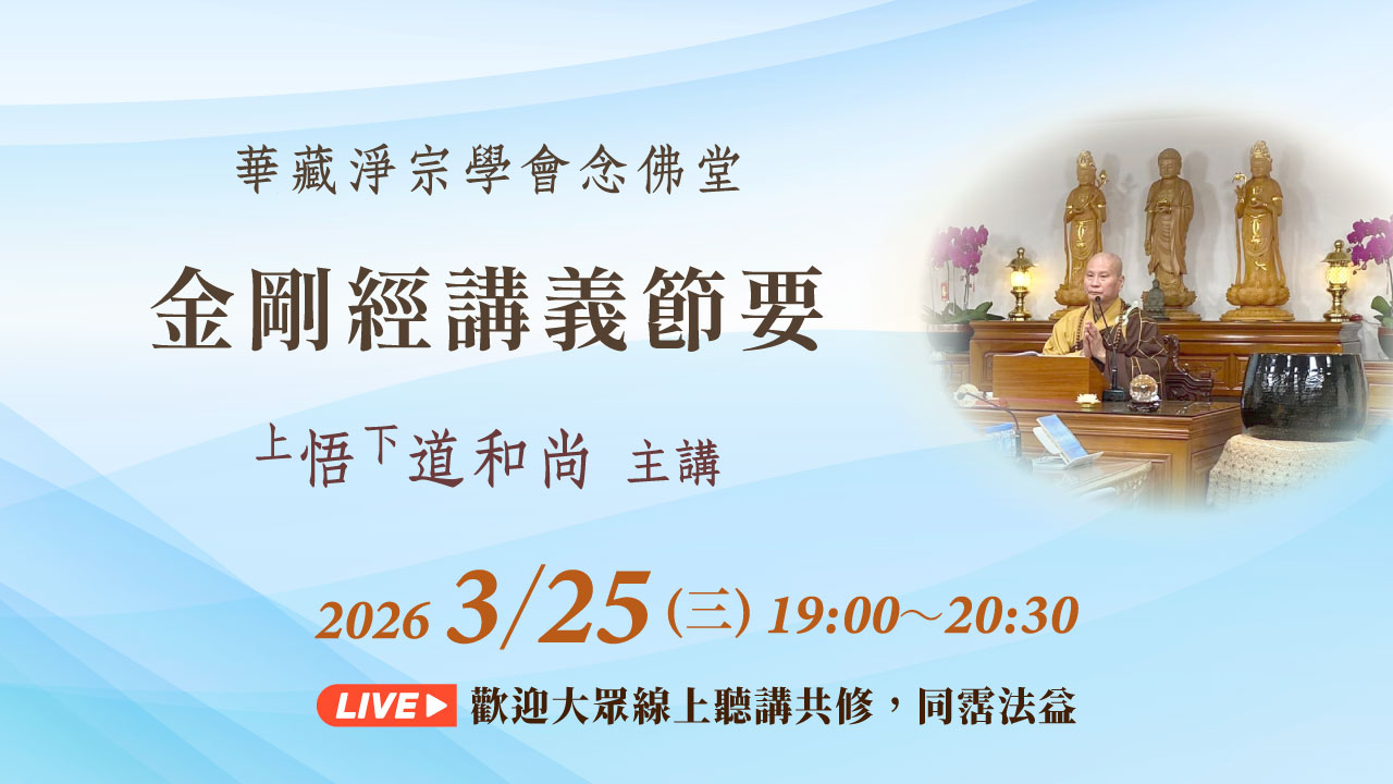 3/25(三)晚上7:00華藏念佛堂恭請悟道和尚宣講《金剛經講義節要》,網路直播,歡迎大家線上聽講,同霑法益。相關資訊敬請參閱…