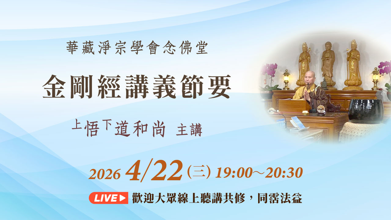 4/15(三)晚上7:00華藏念佛堂恭請悟道和尚主講《金剛經講義節要》,網路直播,歡迎大家線上聽講,同霑法益。相關資訊敬請參閱…
