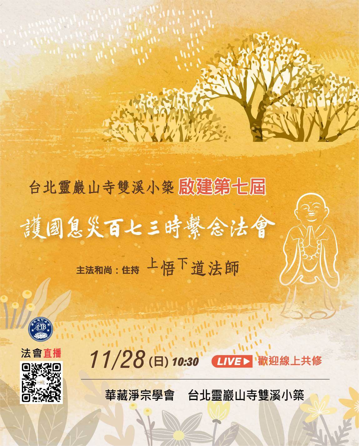 第七屆護國息災百七三時繫念法會,謹訂於2021年11月28日啟建,迄2023年10月28日圓滿。