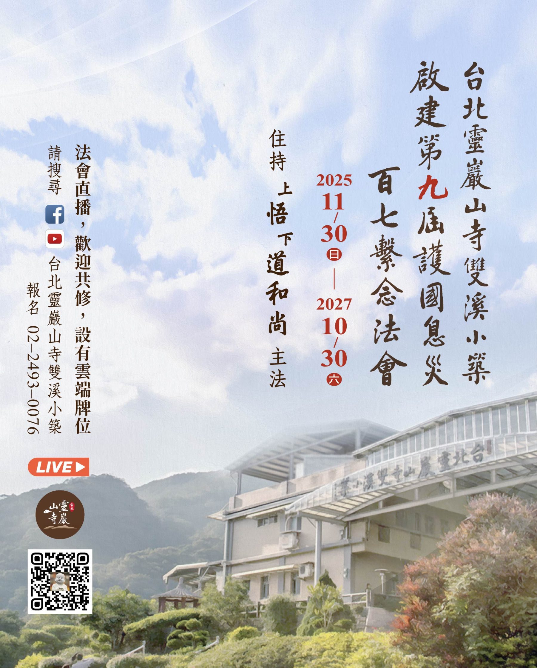 台北靈巖山寺雙溪小築奉囑於2010年元月30日,啟建首屆護國息災百七三時繫念法會至今, 十六年歲月,已圓滿八屆佛事,今啟建第九屆百七繫念法會,誠摯邀請十方大德同共發心,圓成佛事。