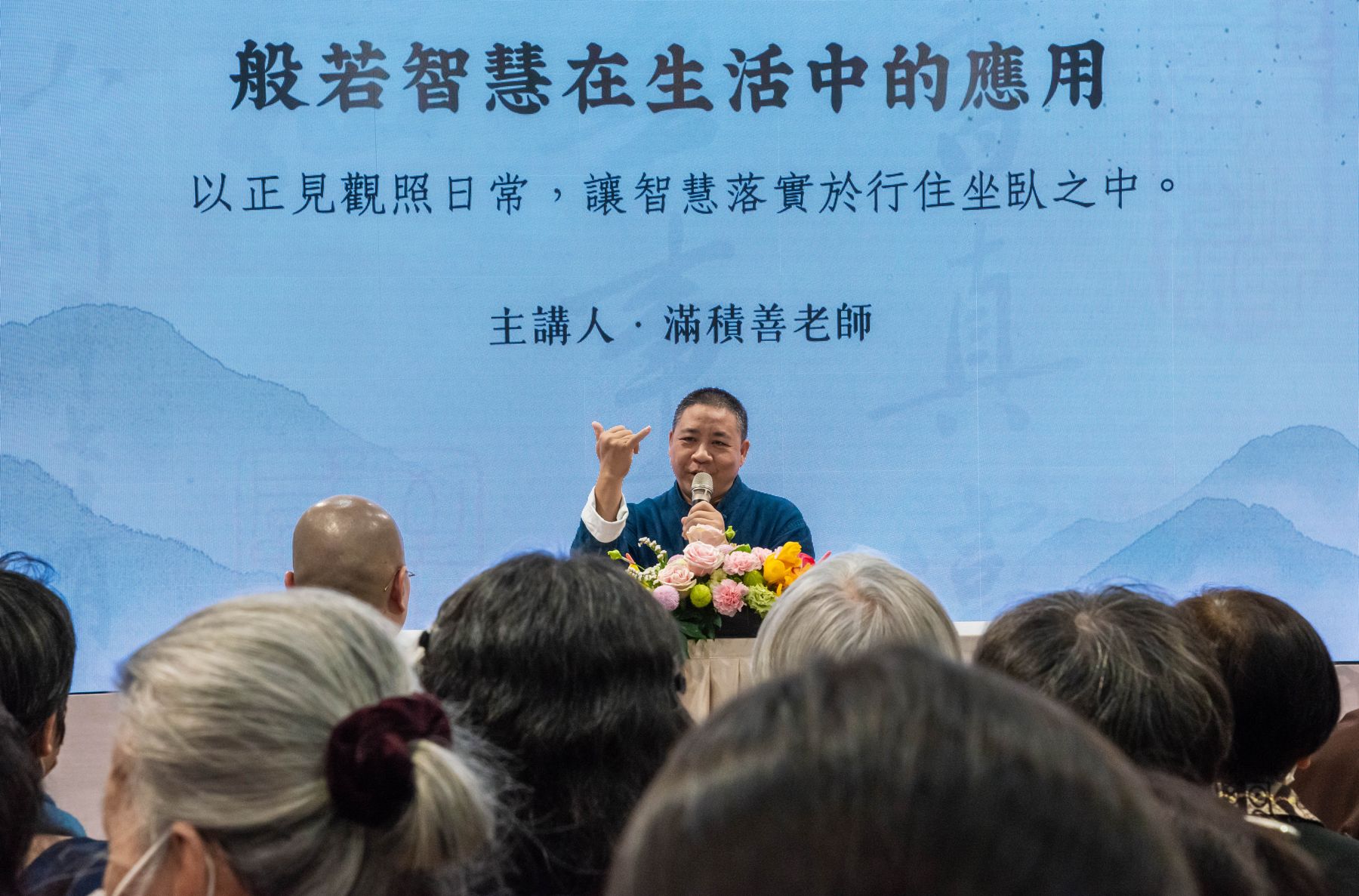 隨後「般若智慧在生活中的應用」,滿積善老師以貼近日常的實例,說明如何以正見觀照行住坐臥,將佛法落實於生活抉擇與待人處事之中,使智慧不只是經文中的名相,而是真正可用、可行的力量。